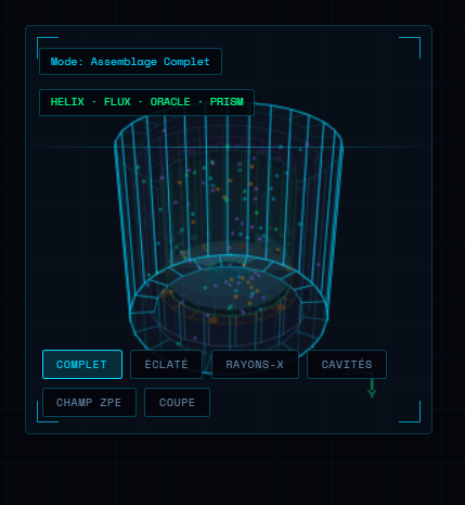 Chaque sous-système du moteur ArkCore modélisé par les agents HELIX, FLUX, PRISM, ORACLE avec spécifications de fabrication complètes.